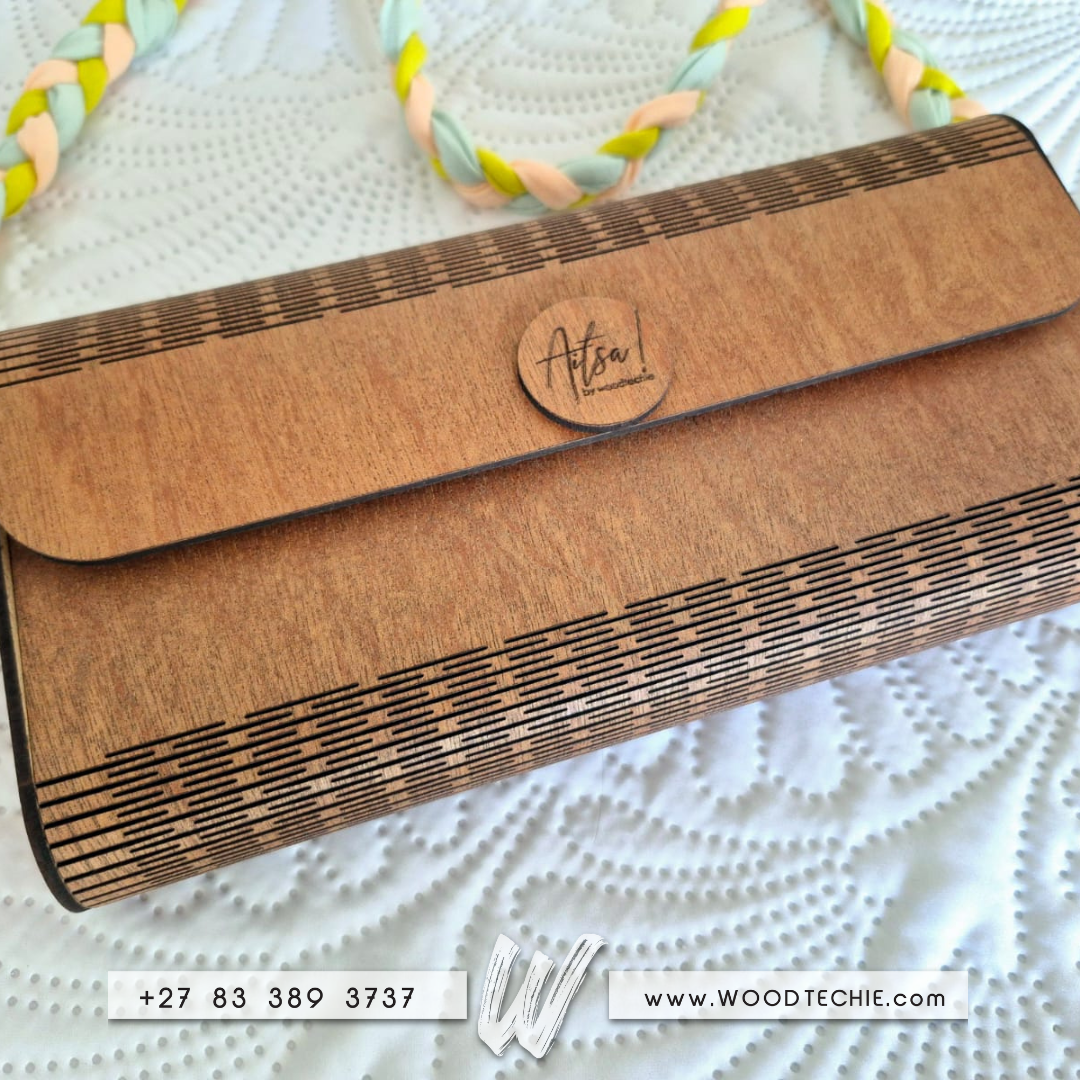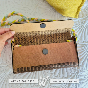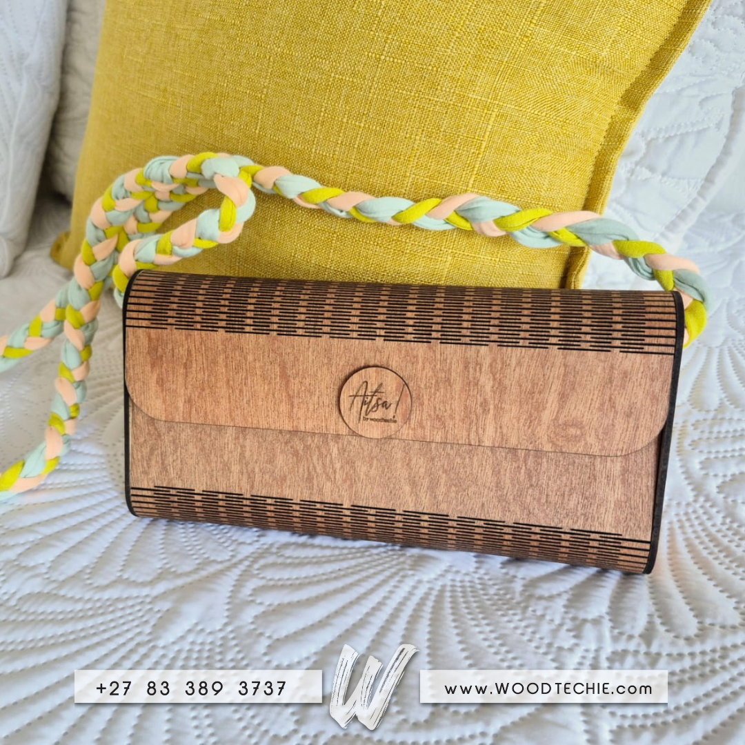 Turn heads with this handcrafted wooden clutch, designed for evenings that deserve a little extra magic. Featuring a smooth wood finish, dark accent stripes, and a pastel braided strap, it’s the perfect blend of natural elegance and modern flair.