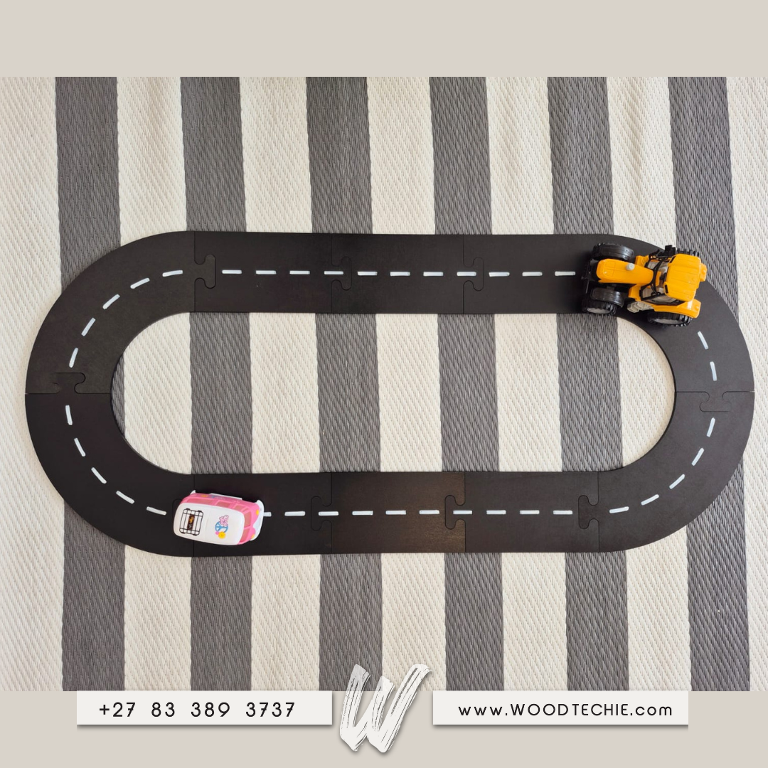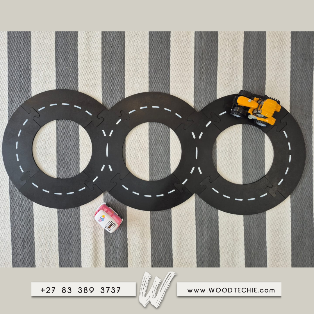 Modular Road Track made from 6mm MDF. Includes 16 pieces. Separate pieces to add on are also available for purchase